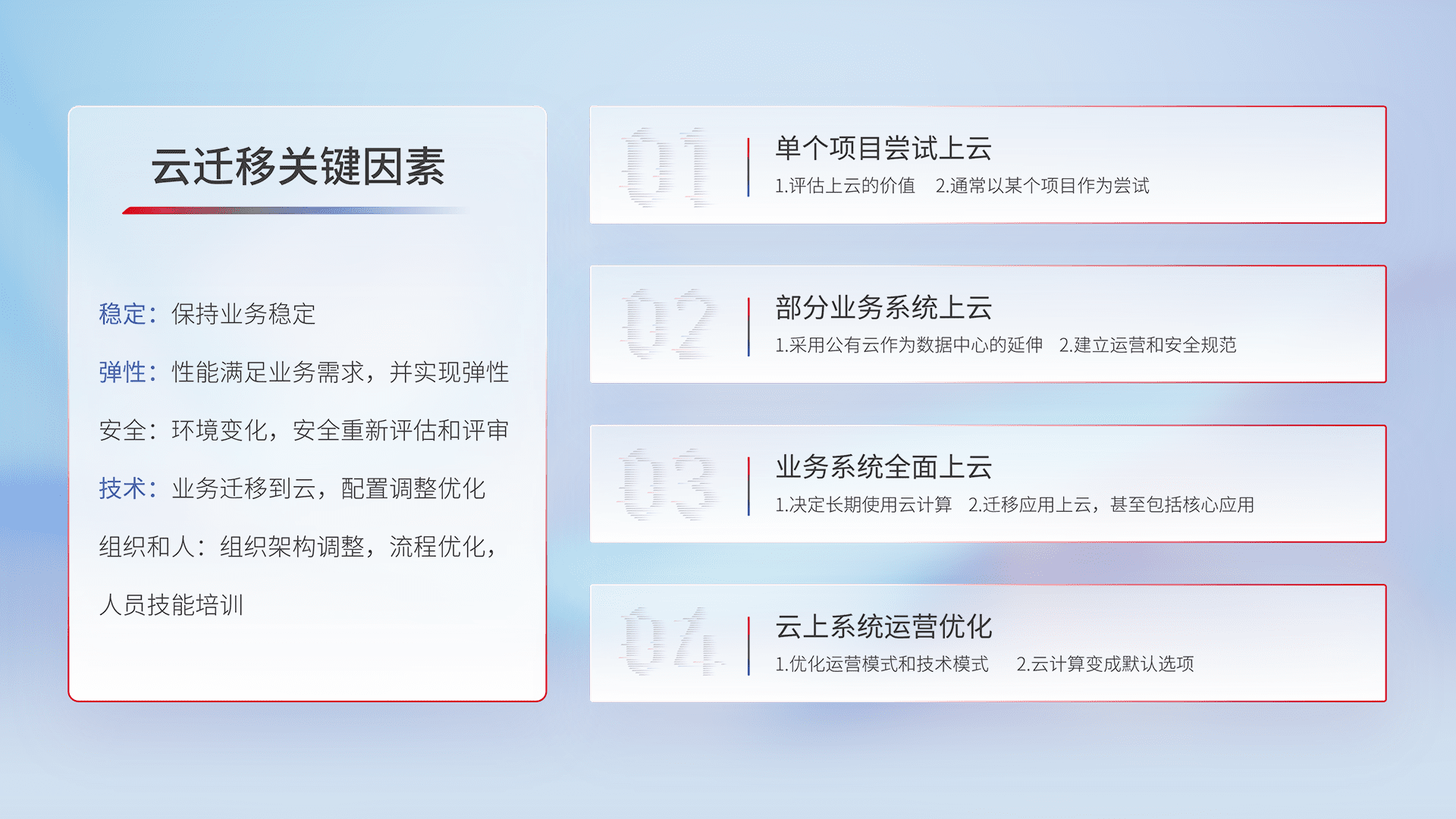 结合实际业务,,,从规划设计、、云平台选型、、、、云原生改造、、、、数据迁移、、、集成交付,,迁移全过程为客户识别最佳上云路径,,,,做好风险识别管理,,,设计网络架构、、、、身份权限、、、、安全审计合规、、、操作审计、、日志审计、、监控告警策略、、、、多站点容灾设计等,,,,对云上基础设施进行整体规划,,提升IT治理水平,,,以满足弹性、、高可用、、、高性能的需求。。。
