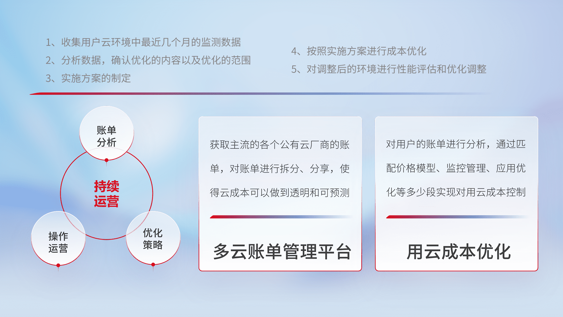 通过灵活运用多种自动化迁移工具,,,,帮助企业用户实现业务和数据高效 、、、稳定的上云迁移和云上迁移,,,,采用自研多云纳管平台,,,,以中立管理模式,,解决多组织、、、多云、、、多运维厂商的复杂关系的管理,,,保证多云平台资源配置的一致性,,实时掌控云资源运行数据,,,,运用智能化工具分析云资源多云平台的管理服务,,,,透明化管理成本支出,,,用云成本可预测、、、、用云费用可优化、、、云资源配额有据可依。。。